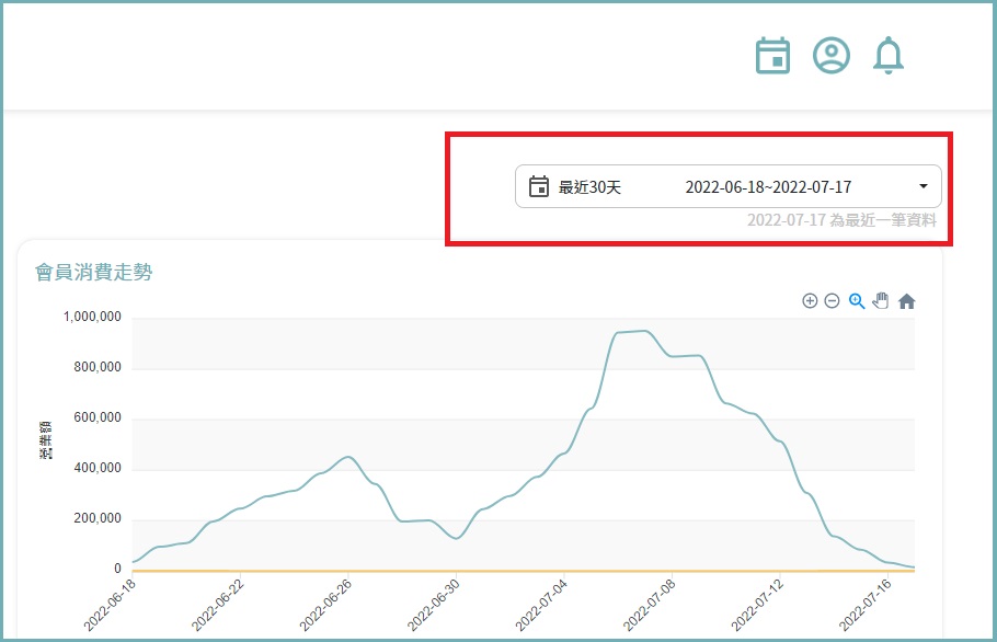 * 右上角可進&#x884C;**「時間篩選」**&#x4F86;查看不同時段表現，其中底下灰字顯示為最近一筆所匯入的資料。