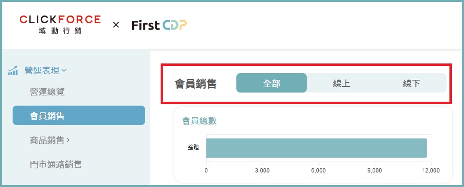 * 在營運總覽、會員銷售、商品銷售的頁面中，左上標籤可選擇「**全部」、「線上」與「線下」**